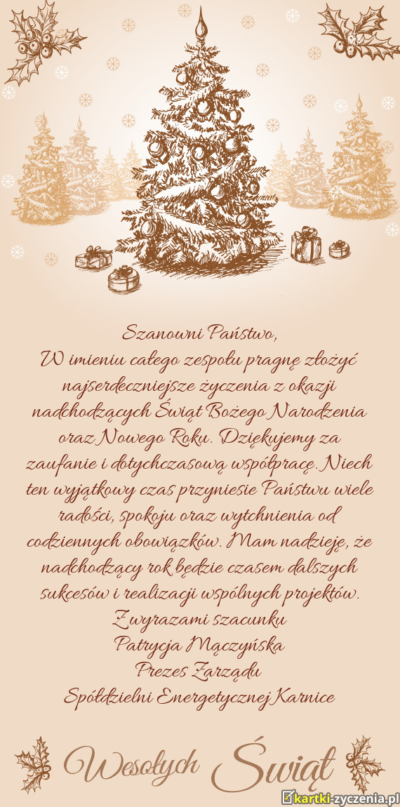 W imieniu całego zespołu pragnę złożyć najserdeczniejsze życzenia z okazji nadchodzących Świąt Bożego Narodzenia oraz Nowego Roku. Dziękujemy za zaufanie i dotychczasową współpracę. Niech ten wyjątkowy czas przyniesie Państwu wiele radości, spokoju oraz wytchnienia od codziennych obowiązków. Mam nadzieję, że nadchodzący rok będzie czasem dalszych sukcesów i realizacji wspólnych projektów.