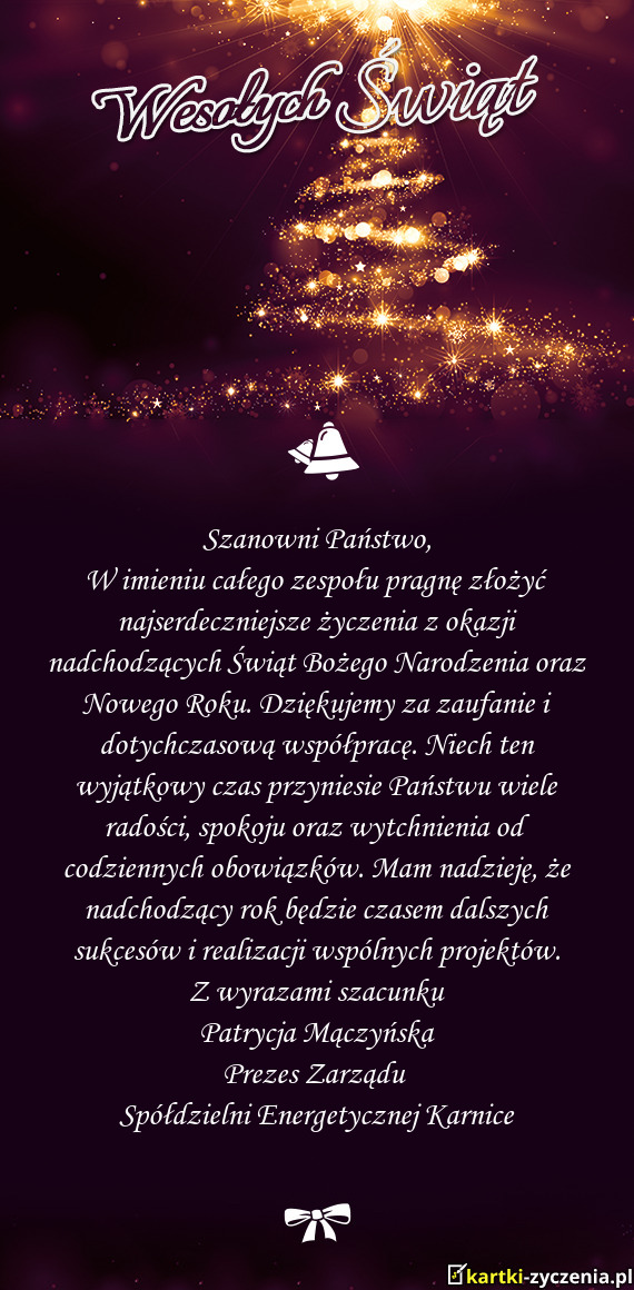 W imieniu całego zespołu pragnę złożyć najserdeczniejsze życzenia z okazji nadchodzących Świąt Bożego Narodzenia oraz Nowego Roku. Dziękujemy za zaufanie i dotychczasową współpracę. Niech ten wyjątkowy czas przyniesie Państwu wiele radości, spokoju oraz wytchnienia od codziennych obowiązków. Mam nadzieję, że nadchodzący rok będzie czasem dalszych sukcesów i realizacji wspólnych projektów.