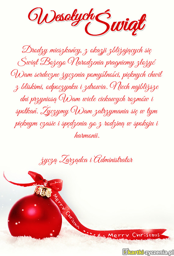Drodzy mieszkańcy, z okazji zbliżających się Świąt Bożego Narodzenia pragniemy złożyć Wam