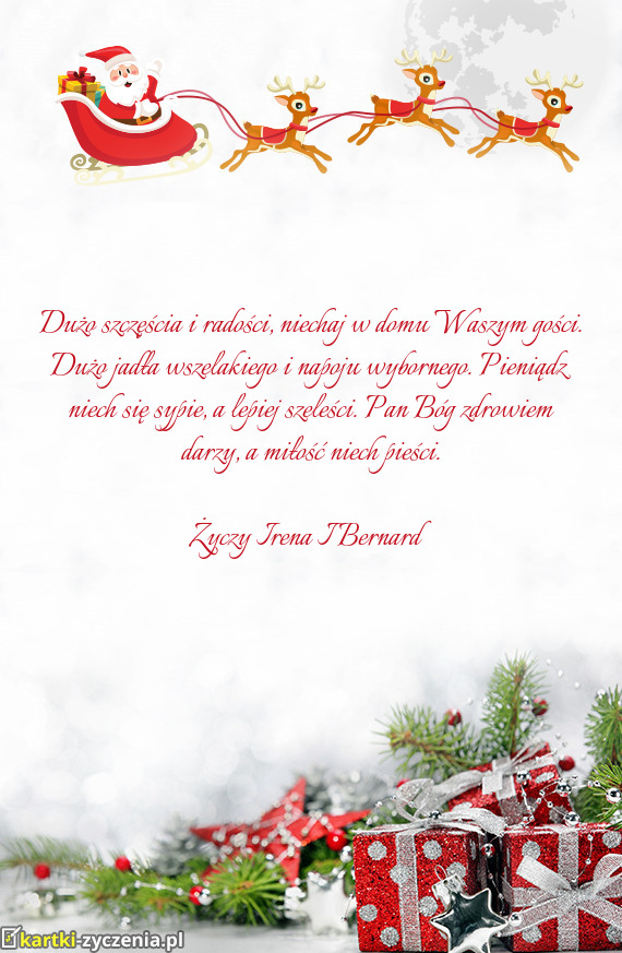 Dużo szczęścia i radości, niechaj w domu Waszym gości. Dużo jadła wszelakiego i napoju wybornego. Pieniądz niech się sypie, a lepiej szeleści. Pan Bóg zdrowiem darzy, a miłość niech pieści.