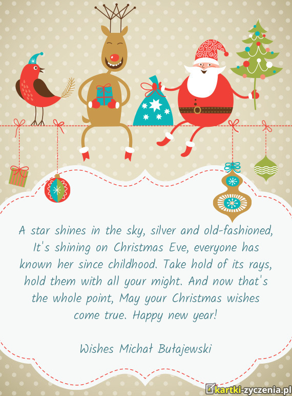 A star shines in the sky, silver and old-fashioned, It's shining on Christmas Eve, everyone has know