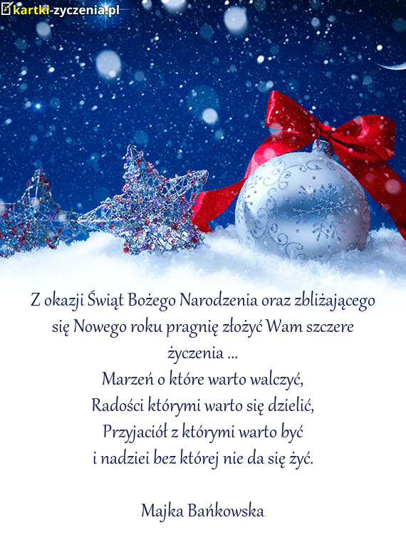 Są słowa zwyczajne, proste, piękne. Słowa znajome, bliskie, ciepłe. Słowa magiczne, które otwierają serca, duszę i budzą myśli. Z okazji Świąt Bożego Narodzenia i Nowego Roku życzę Tobie ciepła rodzinnego, niegasnącej przyjaźni oraz światła, które zawsze prowadzi tam, dokąd zechcesz. Niech Nowy rok przyniesie dobre zdrowie, siłę woli i wytrwałość i niech opiewa w same sukcesy!