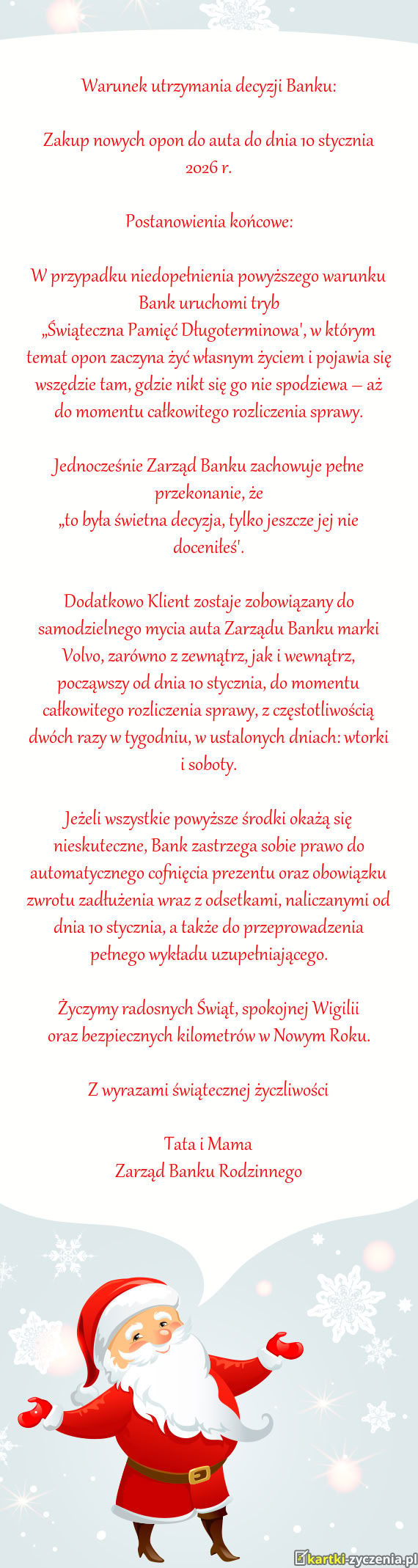 Jeżeli wszystkie powyższe środki okażą się nieskuteczne, Bank zastrzega sobie prawo do automatycznego cofnięcia prezentu oraz obowiązku zwrotu zadłużenia wraz z odsetkami, naliczanymi od dnia 10 stycznia, a także do przeprowadzenia pełnego wykładu uzupełniającego.