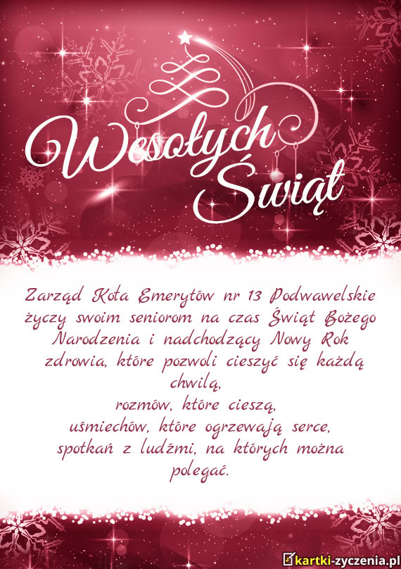 Zarząd Koła Emerytów nr 13 Podwawelskie życzy swoim seniorom na czas Świąt Bożego Narodzenia