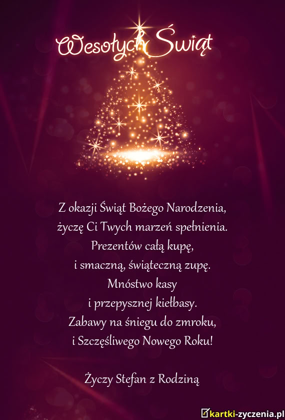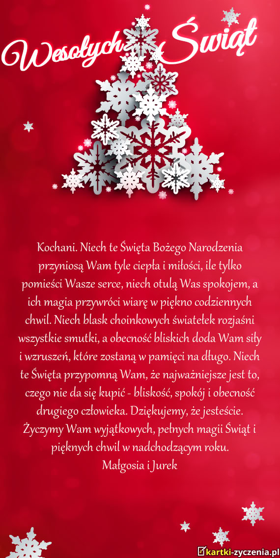 Kochani. Niech te Święta Bożego Narodzenia przyniosą Wam tyle ciepła i miłości, ile tylko pomieści Wasze serce, niech otulą Was spokojem, a ich magia przywróci wiarę w piękno codziennych chwil. Niech blask choinkowych światełek rozjaśni wszystkie smutki, a obecność bliskich doda Wam siły i wzruszeń, które zostaną w pamięci na długo. Niech te Święta przypomną Wam, że najważniejsze jest to, czego nie da się kupić - bliskość, spokój i obecność drugiego człowieka. Dziękujemy, że jesteście.
