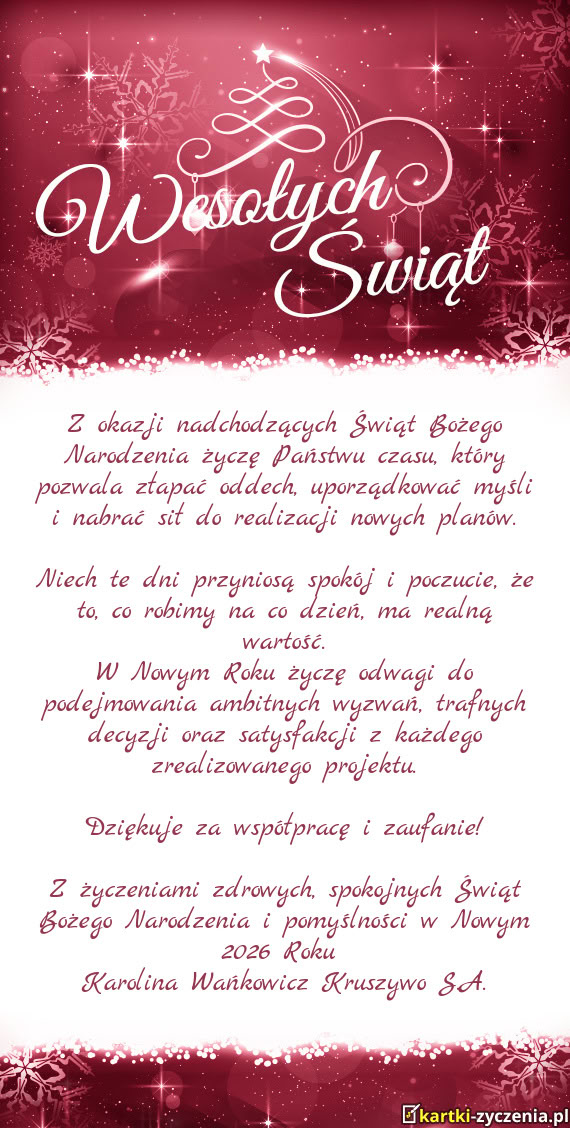 Z okazji nadchodzących Świąt Bożego Narodzenia życzę Państwu czasu, który pozwala złapać o
