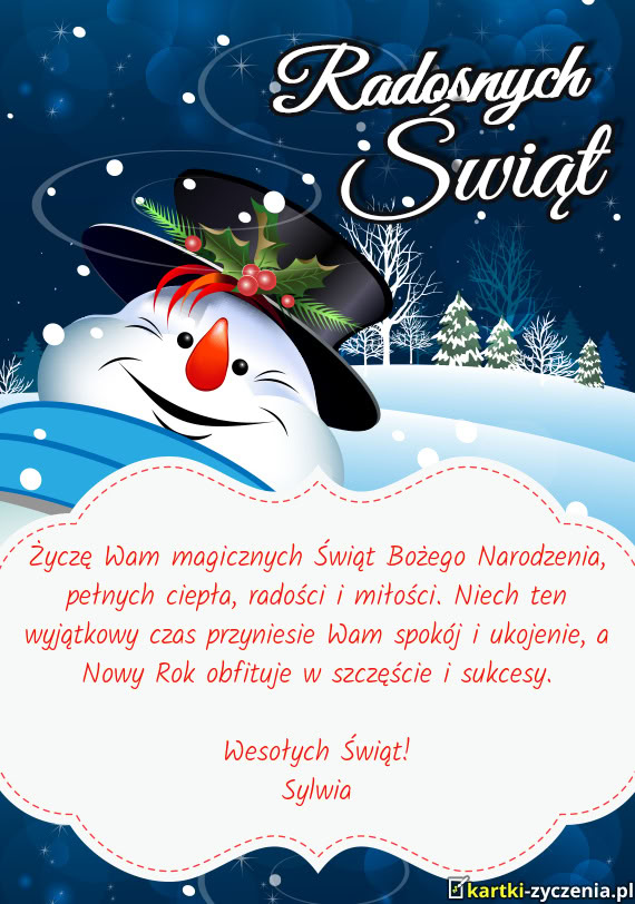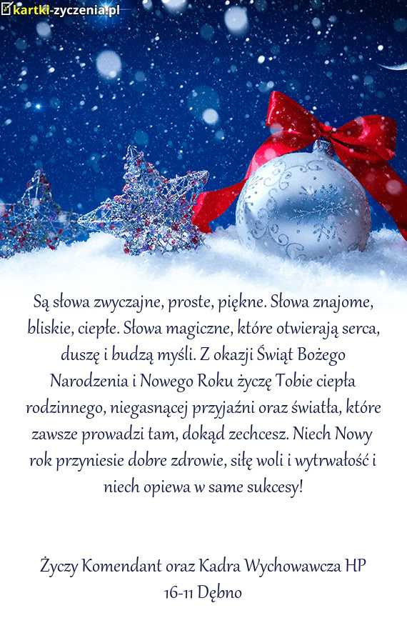 Są słowa zwyczajne, proste, piękne. Słowa znajome, bliskie, ciepłe. Słowa magiczne, które otwierają serca, duszę i budzą myśli. Z okazji Świąt Bożego Narodzenia i Nowego Roku życzę Tobie ciepła rodzinnego, niegasnącej przyjaźni oraz światła, które zawsze prowadzi tam, dokąd zechcesz. Niech Nowy rok przyniesie dobre zdrowie, siłę woli i wytrwałość i niech opiewa w same sukcesy!