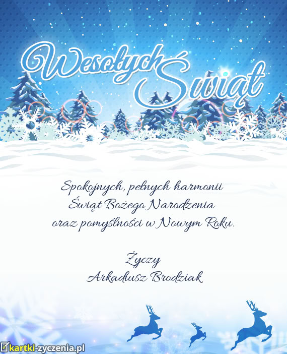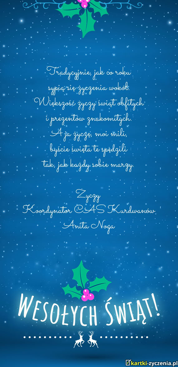 Są słowa zwyczajne, proste, piękne. Słowa znajome, bliskie, ciepłe. Słowa magiczne, które otwierają serca, duszę i budzą myśli. Z okazji Świąt Bożego Narodzenia i Nowego Roku życzę Tobie i Twoim najbliższym ciepła rodzinnego, niegasnącej przyjaźni oraz światła, które zawsze prowadzi tam, dokąd zechcesz. Niech Nowy rok przyniesie dobre zdrowie, siłę woli i wytrwałość i niech opiewa w same sukcesy!