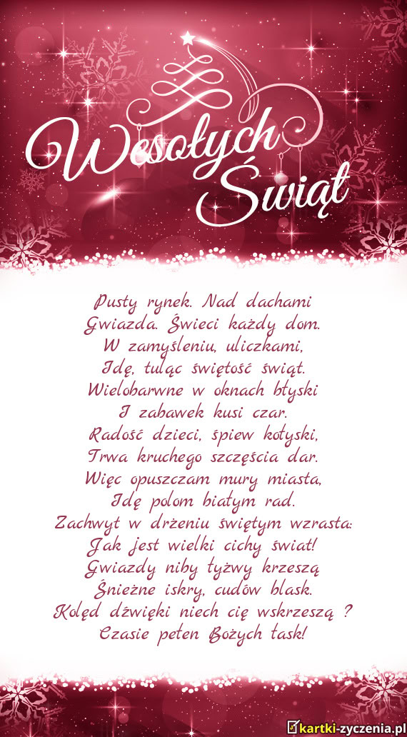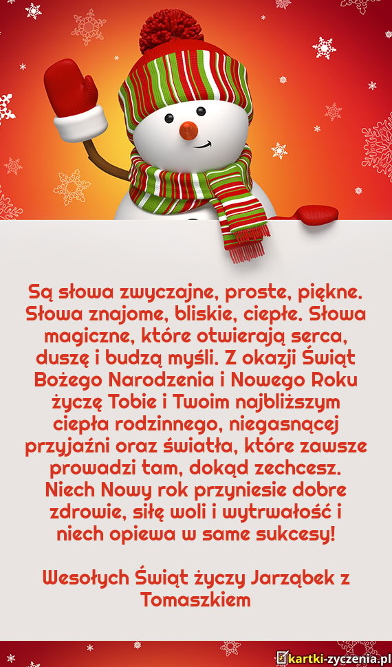 Są słowa zwyczajne, proste, piękne. Słowa znajome, bliskie, ciepłe. Słowa magiczne, które otwierają serca, duszę i budzą myśli. Z okazji Świąt Bożego Narodzenia i Nowego Roku życzę Tobie i Twoim najbliższym ciepła rodzinnego, niegasnącej przyjaźni oraz światła, które zawsze prowadzi tam, dokąd zechcesz. Niech Nowy rok przyniesie dobre zdrowie, siłę woli i wytrwałość i niech opiewa w same sukcesy!