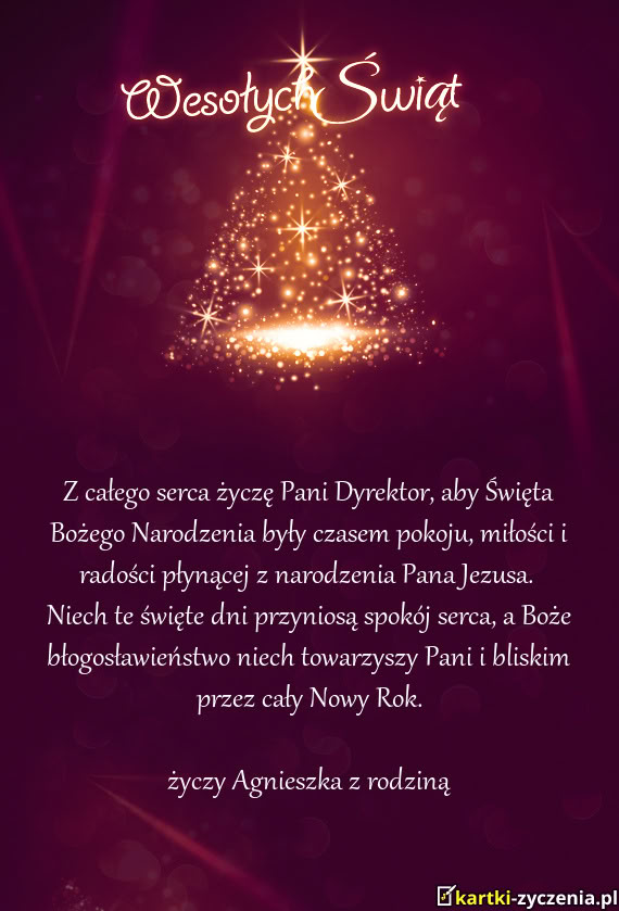Z całego serca życzę Pani Dyrektor, aby Święta Bożego Narodzenia były czasem pokoju, miłośc