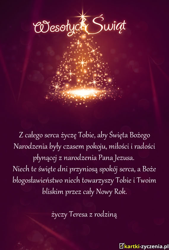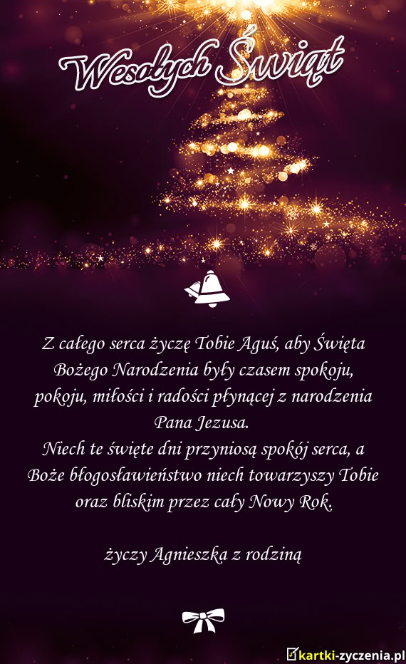 Z całego serca życzę Tobie Aguś, aby Święta Bożego Narodzenia były czasem spokoju, pokoju, m