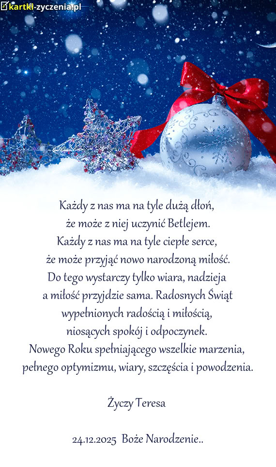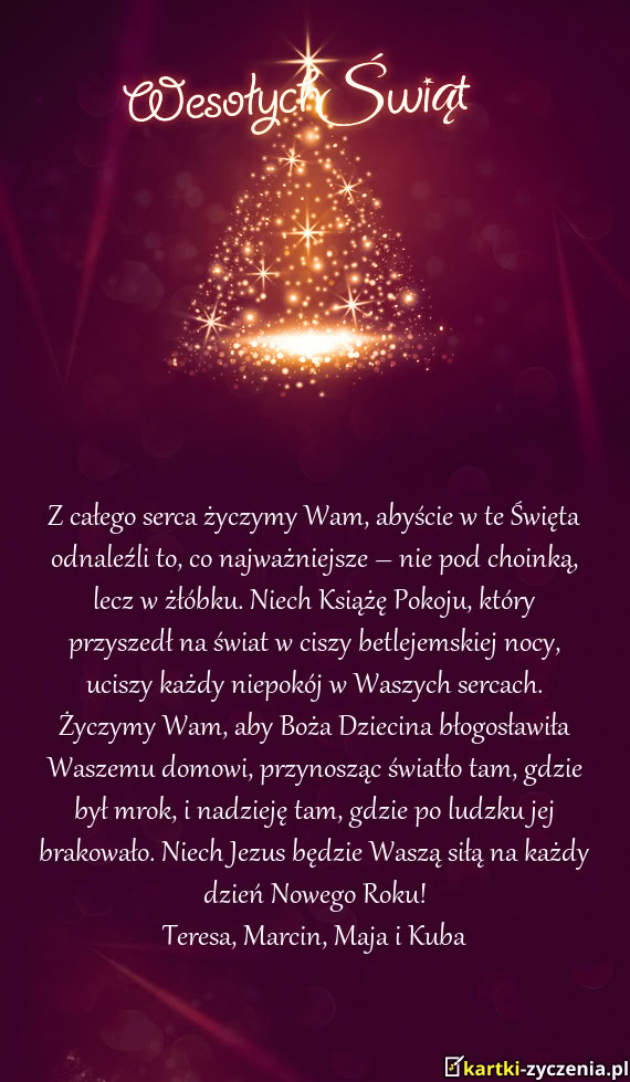 Z całego serca życzymy Wam, abyście w te Święta odnaleźli to, co najważniejsze – nie pod choinką, lecz w żłóbku. Niech Książę Pokoju, który przyszedł na świat w ciszy betlejemskiej nocy, uciszy każdy niepokój w Waszych sercach. Życzymy Wam, aby Boża Dziecina błogosławiła Waszemu domowi, przynosząc światło tam, gdzie był mrok, i nadzieję tam, gdzie po ludzku jej brakowało. Niech Jezus będzie Waszą siłą na każdy dzień Nowego Roku!