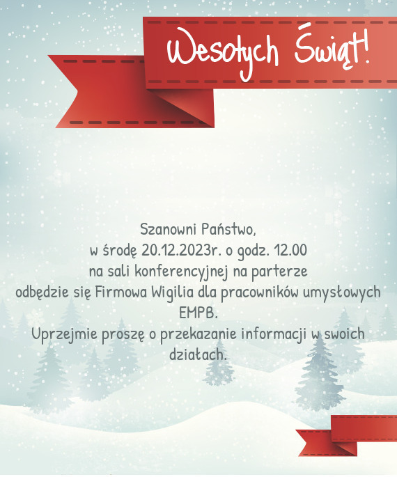odbędzie się Firmowa Wigilia dla pracowników umysłowych EMPB.