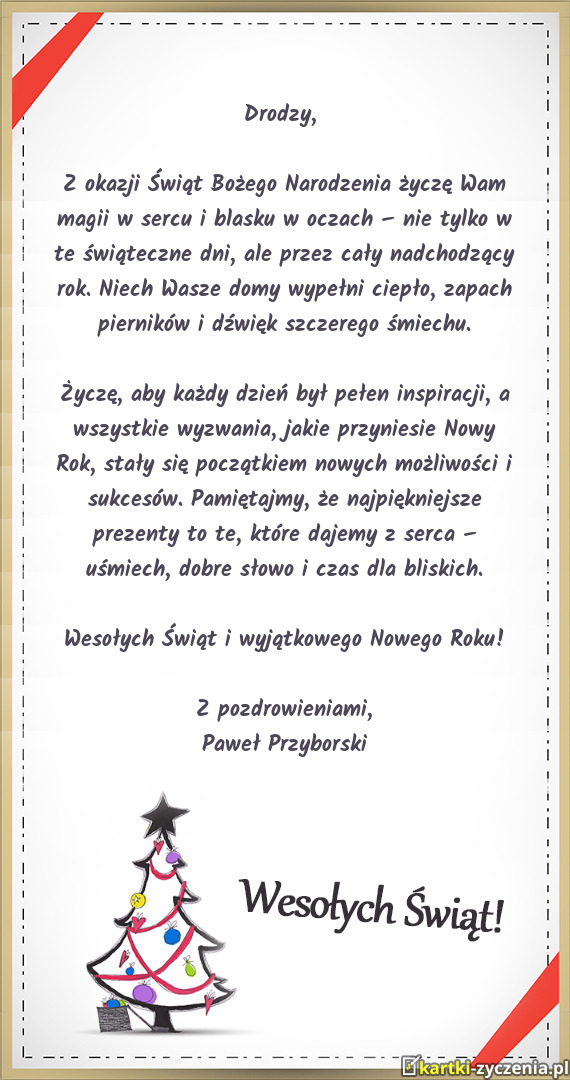 Z okazji Świąt Bożego Narodzenia życzę Wam magii w sercu i blasku w oczach – nie tylko w te świąteczne dni, ale przez cały nadchodzący rok. Niech Wasze domy wypełni ciepło, zapach pierników i dźwięk szczerego śmiechu.