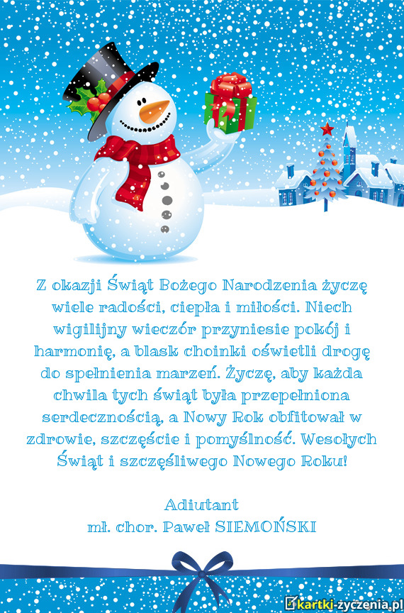 Z okazji Świąt Bożego Narodzenia życzę wiele radości, ciepła i miłości. Niech wigilijny wieczór przyniesie pokój i harmonię, a blask choinki oświetli drogę do spełnienia marzeń. Życzę, aby każda chwila tych świąt była przepełniona serdecznością, a Nowy Rok obfitował w zdrowie, szczęście i pomyślność. Wesołych Świąt i szczęśliwego Nowego Roku!