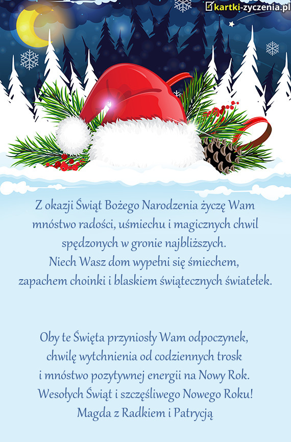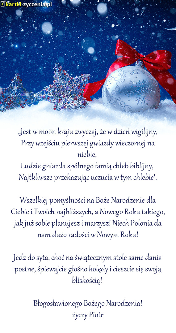 Wszelkiej pomyślności na Boże Narodzenie dla Ciebie i Twoich najbliższych, a Nowego Roku takiego, jak już sobie planujesz i marzysz! Niech Polonia da nam dużo radości w Nowym Roku!