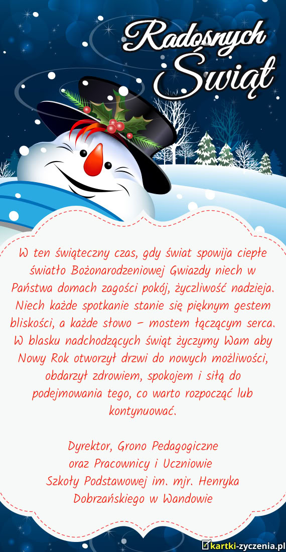 W ten świąteczny czas, gdy świat spowija ciepłe światło Bożonarodzeniowej Gwiazdy niech w Państwa domach zagości pokój, życzliwość nadzieja. Niech każde spotkanie stanie się pięknym gestem bliskości, a każde słowo – mostem łączącym serca.