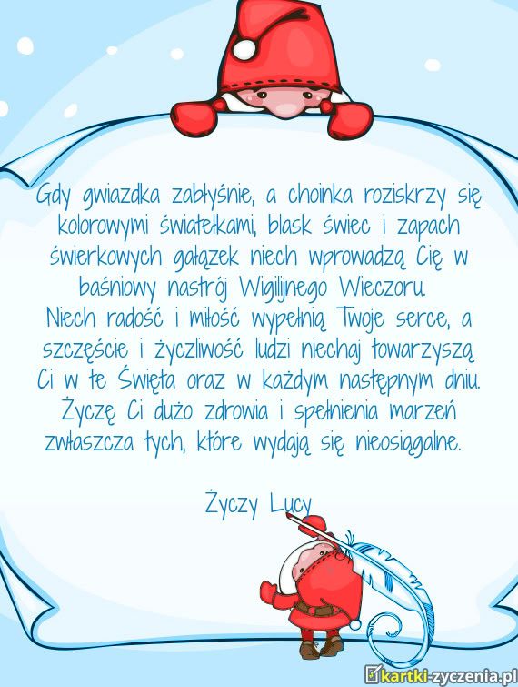 Gdy gwiazdka zabłyśnie, a choinka roziskrzy się kolorowymi światełkami, blask świec i zapach świerkowych gałązek niech wprowadzą Cię w baśniowy nastrój Wigilijnego Wieczoru.