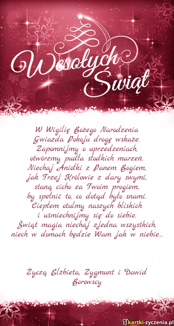 Z okazji Świąt Bożego Narodzenia życzymy Wam wiele radości, ciepła i miłości. Niech wigilijny wieczór przyniesie pokój i harmonię, a blask choinki oświetli drogę do spełnienia marzeń. Życzymy, aby każda chwila tych świąt była przepełniona serdecznością, a Nowy Rok obfitował w zdrowie, szczęście i pomyślność.