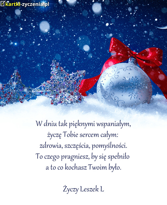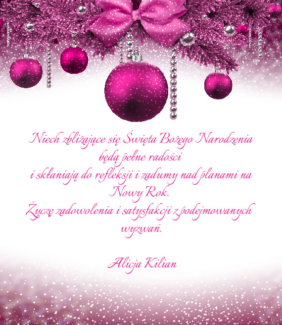 Radosnych Świąt Bożego Narodzenia, odpoczynku w rodzinnym gronie, pięknie pachnącej choinki, zdrowia i radości na co dzień, pasma sukcesów, spełnienia najskrytszych marzeń oraz uśmiechu i życzliwości na każdy dzień Nowego Roku