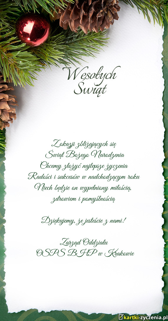 Z okazji Świat Bożego Narodzenia oraz zbliżającego Nowego Roku Pragniemy Serdecznie podziękować Państwu za dotychczasową współpracę oraz złożyć moc gorących życzeń, zdrowia, szczęścia i wszelkiej pomyślności