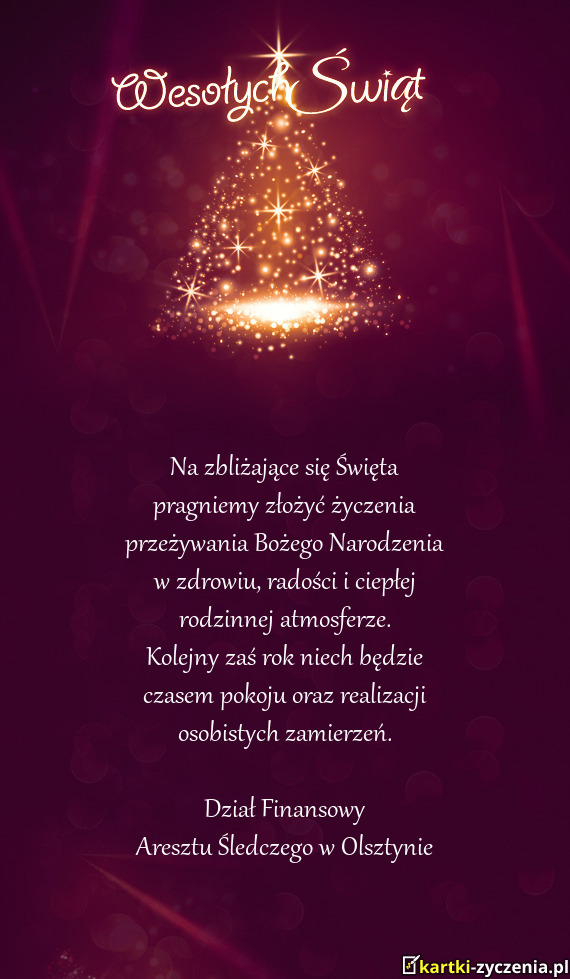 Z okazji Świąt Bożego Narodzenia Składamy Wam i Waszym Bliskim życzenia pięknych i radosnych Świąt wypełnionych miłością i ciepłem rodzinnej atmosfery. Niech ten magiczny czas przyniesie Wam spokój, uśmiech na twarzy i wzruszenia serca. Niech Nowy Rok niesie ze sobą wiele sukcesów, spełnienia marzeń i niezapomnianych chwil. Z najserdeczniejszymi