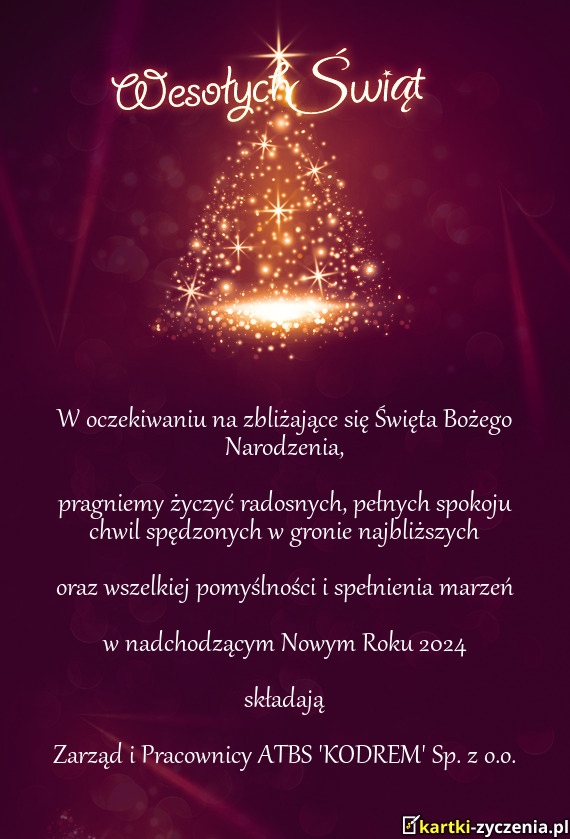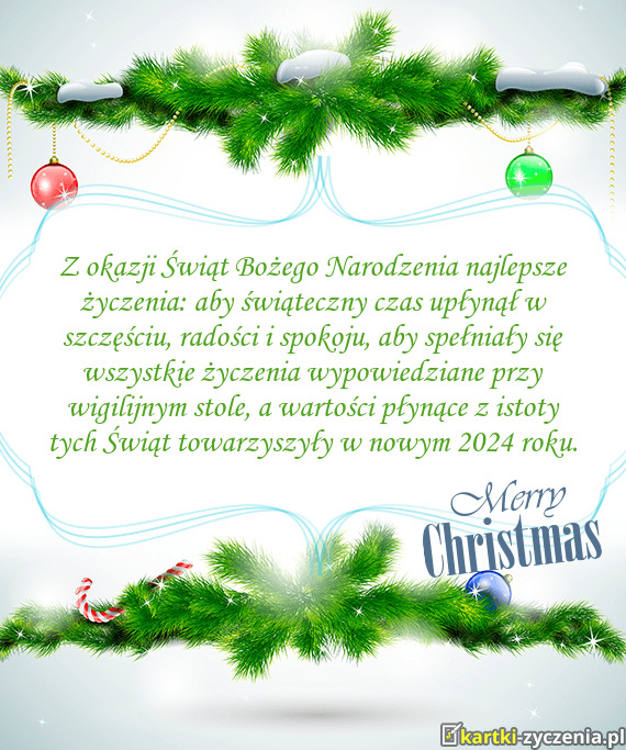 Z okazji Świąt Bożego Narodzenia najlepsze życzenia: aby świąteczny czas upłynął w szczęściu, radości i spokoju, aby spełniały się wszystkie życzenia wypowiedziane przy wigilijnym stole, a wartości płynące z istoty tych Świąt towarzyszyły w nowym 2024 roku.