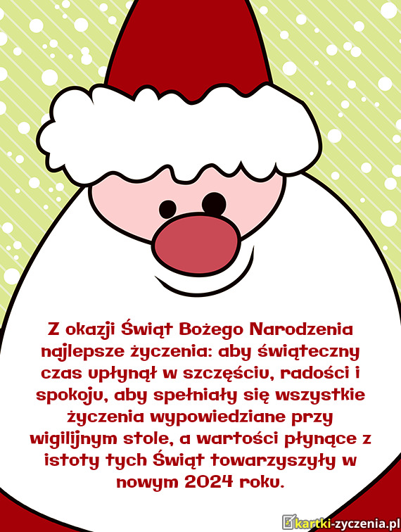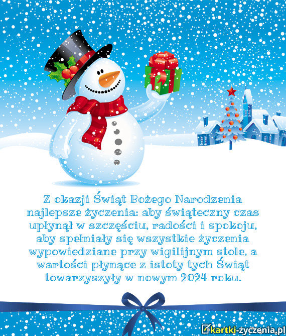 Z okazji Świąt Bożego Narodzenia najlepsze życzenia: aby świąteczny czas upłynął w szczęściu, radości i spokoju, aby spełniały się wszystkie życzenia wypowiedziane przy wigilijnym stole, a wartości płynące z istoty tych Świąt towarzyszyły w nowym 2024 roku.