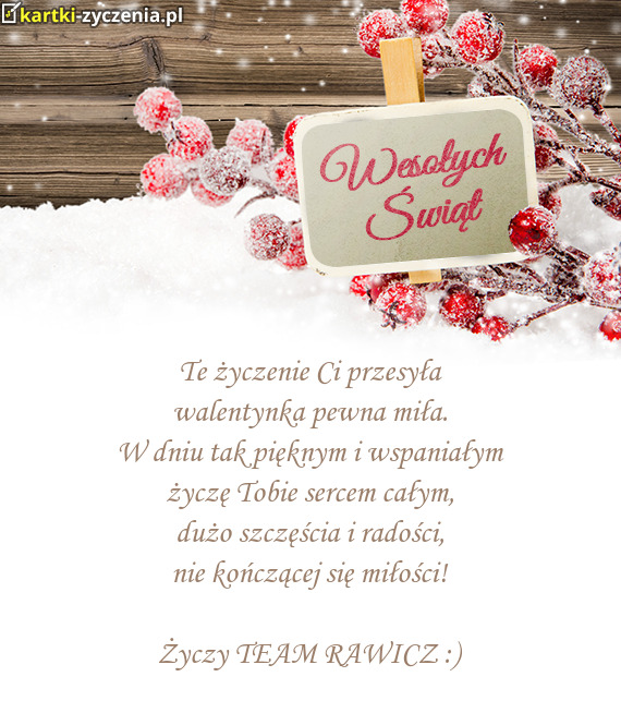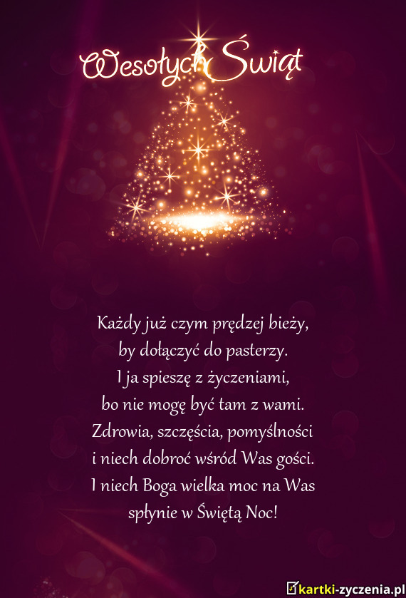 Spokojnych pelnych milosci Swiat Bozego Narodzenia. Niech to beda Swieta, ktore niosa radosc, milosc i wiare w lepsze jutro. Nowy Rok niech przyniesie duzo zdrowia i pogody ducha oraz wszelkiej pomyslnosci dla calej rodziny.