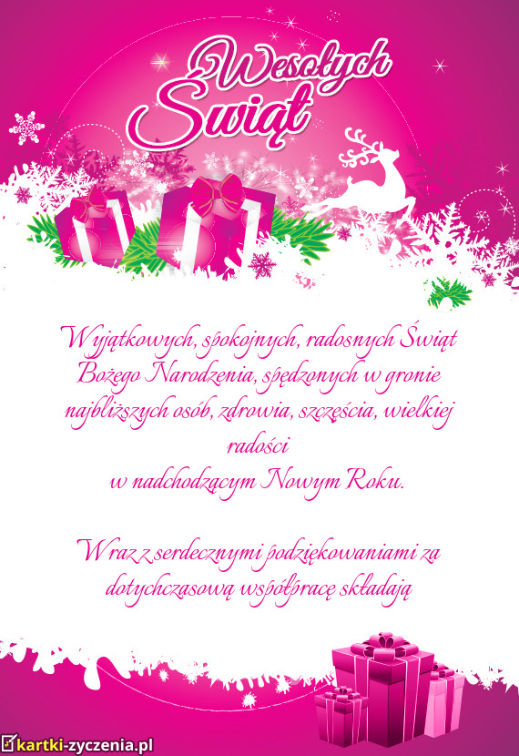 Cudownych i mroźnych Świąt Bożego Narodzenia, prawdziwej zimy za oknem i ciepła rodzinnego. Niepowtarzalnych wzruszeń i zaskakujących prezentów.