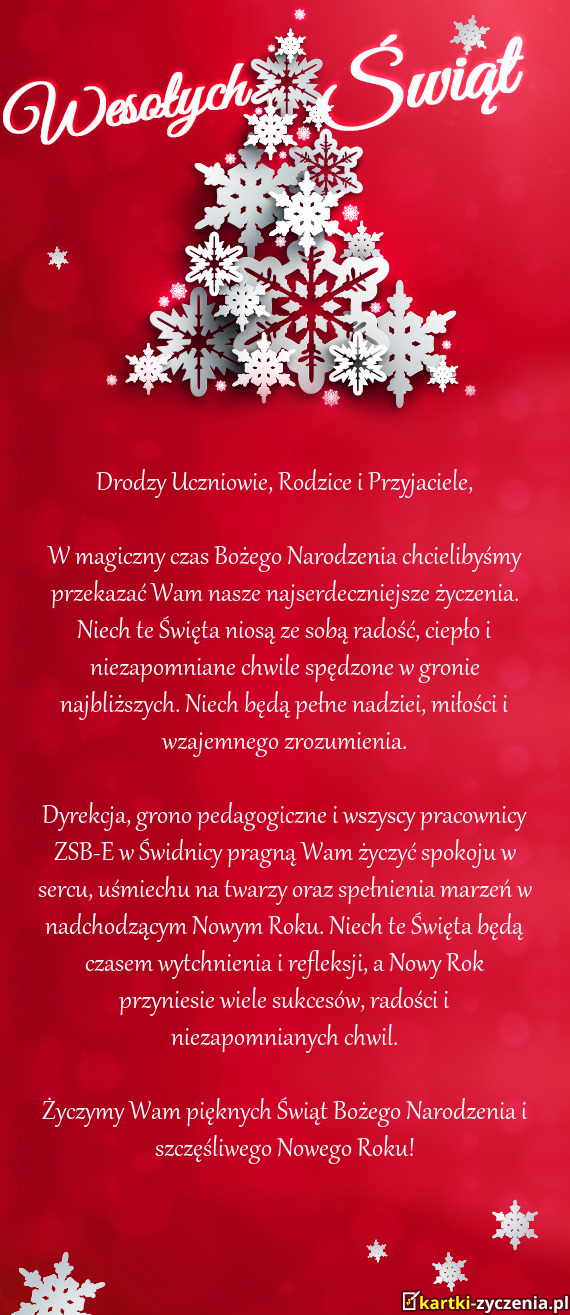 Dyrekcja, grono pedagogiczne i wszyscy pracownicy ZSB-E w Świdnicy pragną Wam życzyć spokoju w sercu, uśmiechu na twarzy oraz spełnienia marzeń w nadchodzącym Nowym Roku. Niech te Święta będą czasem wytchnienia i refleksji, a Nowy Rok przyniesie wiele sukcesów, radości i niezapomnianych chwil.