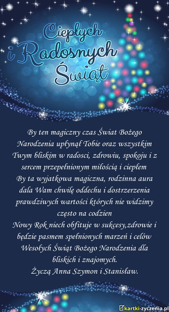 Niech czas Bożego Narodzenia będzie pełen ciepła, radości i wytchnienia od codziennego pędu. Zdrowych i pogodnych Świąt Bożego Narodzenia oraz wszelkiej pomyślności w Nowym Roku życzą Agnieszka z Piotrem