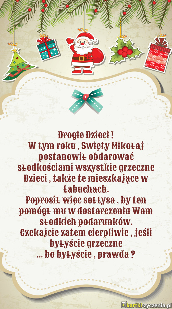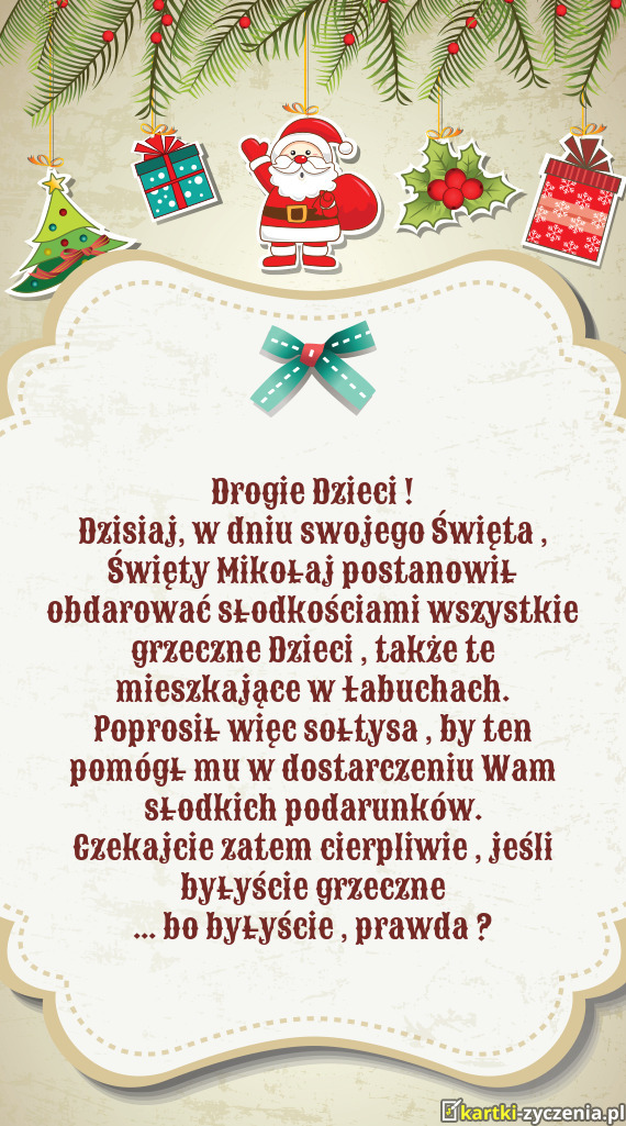 Dzisiaj, w dniu swojego Święta , Święty Mikołaj postanowił obdarować słodkościami wszystkie - Gotowa Kartka bożonarodzeniowa