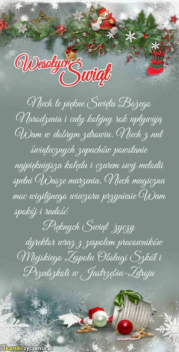 Niech te piękne Święta Bożego Narodzenia i cały kolejny rok upływają Wam w dobrym zdrowiu. Niech z nut świątecznych zapachów powstanie najpiękniejsza kolęda i czarem swej melodii spełni Wasze marzenia. Niech magiczna moc wigilijnego wieczoru przyniesie Wam spokój i radość Pięknych Świąt życzy