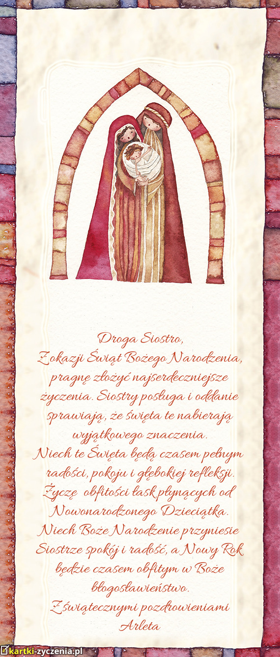 Niech Boże Narodzenie przyniesie Siostrze spokój i radość, a Nowy Rok będzie czasem obfitym w Boże błogosławieństwo.