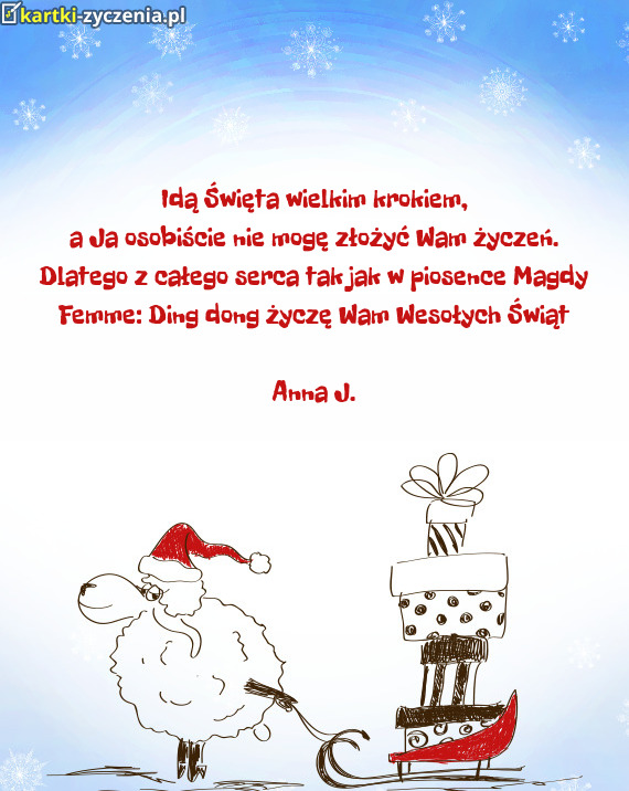 a Ja osobiście nie mogę złożyć Wam życzeń dlatego z całego serca tak jak w piosence Magdy Femme: Ding dong życzę Wam Wesołych Świąt