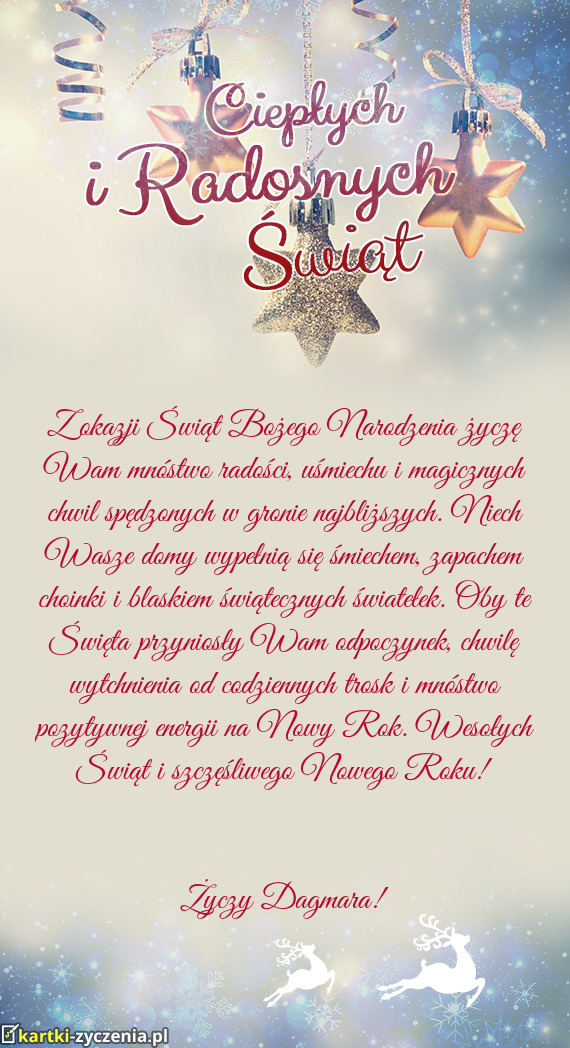 Z okazji Świąt Bożego Narodzenia życzę Wam mnóstwo radości, uśmiechu i magicznych chwil spędzonych w gronie najbliższych. Niech Wasze domy wypełnią się śmiechem, zapachem choinki i blaskiem świątecznych światełek. Oby te Święta przyniosły Wam odpoczynek, chwilę wytchnienia od codziennych trosk i mnóstwo pozytywnej energii na Nowy Rok. Wesołych Świąt i szczęśliwego Nowego Roku!
