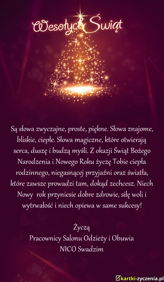 Są słowa zwyczajne, proste, piękne. Słowa znajome, bliskie, ciepłe. Słowa magiczne, które otwierają serca, duszę i budzą myśli. Z okazji Świąt Bożego Narodzenia i Nowego Roku życzymy ciepła rodzinnego, niegasnącej przyjaźni oraz światła, które zawsze prowadzi tam, dokąd zechcemy. Niech Nowy rok przyniesie dobre zdrowie, siłę woli i wytrwałość i niech opiewa w same sukcesy!