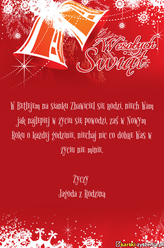 W Betlejem na sianku Zbawiciel się rodzi, niech Wam jak najlepiej w życiu się powodzi, zaś w Nowym Roku o każdej godzinie, niechaj nic co dobre Was w życiu nie minie.