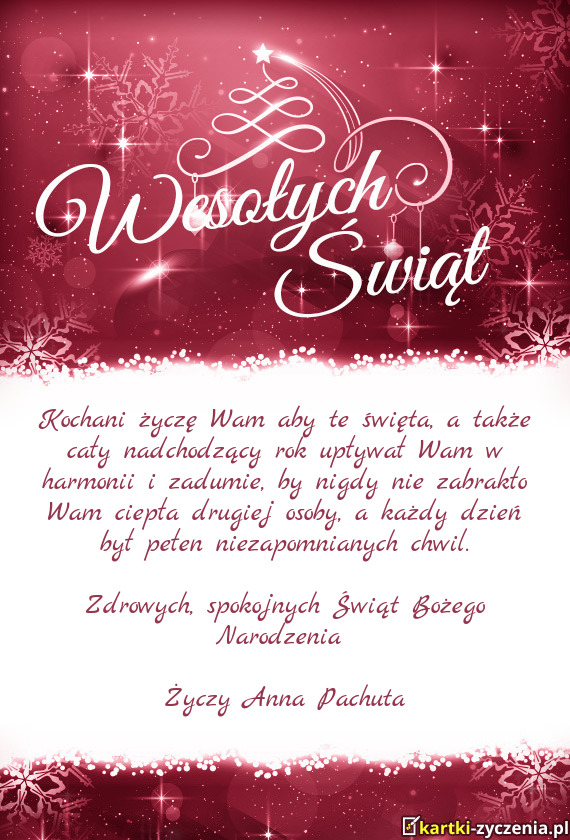 Kochani życzę Wam aby te święta, a także cały nadchodzący rok upływał Wam w harmonii i zadumie, by nigdy nie zabrakło Wam ciepła drugiej osoby, a każdy dzień był pełen niezapomnianych chwil.