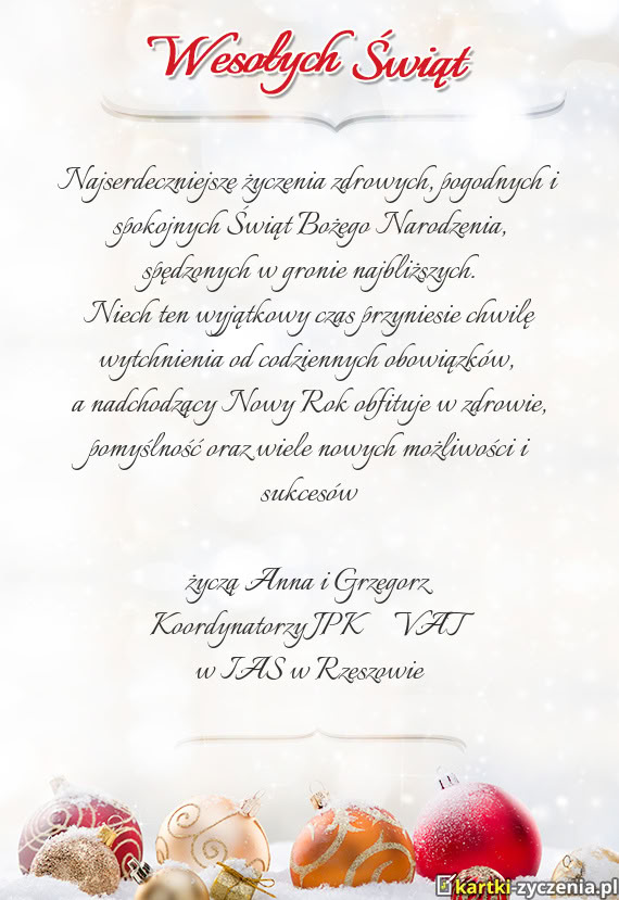 Korzystając z okazji Świąt Bożego Narodzenia, pragniemy złożyć Państwu najserdeczniejsze ży - Gotowa Kartka bożonarodzeniowa