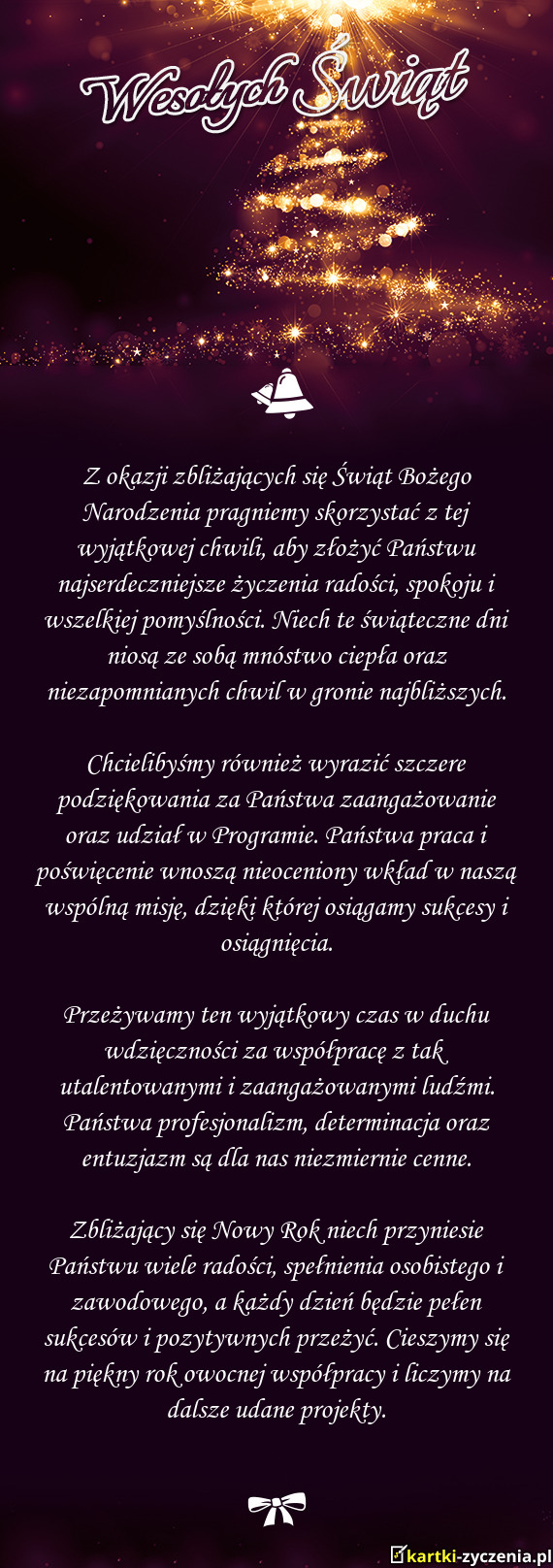 Z okazji zbliżających się Świąt Bożego Narodzenia pragniemy skorzystać z tej wyjątkowej chwili, aby złożyć Państwu najserdeczniejsze życzenia radości, spokoju i wszelkiej pomyślności. Niech te świąteczne dni niosą ze sobą mnóstwo ciepła oraz niezapomnianych chwil w gronie najbliższych.