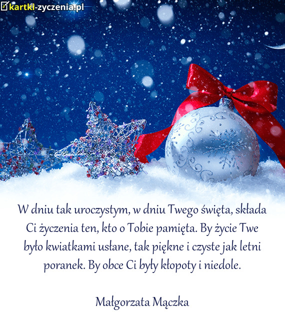 W dniu tak uroczystym, w dniu Twego święta, składa Ci życzenia ten, kto o Tobie pamięta. By życie Twe było kwiatkami usłane, tak piękne i czyste jak letni poranek. By obce Ci były kłopoty i niedole.