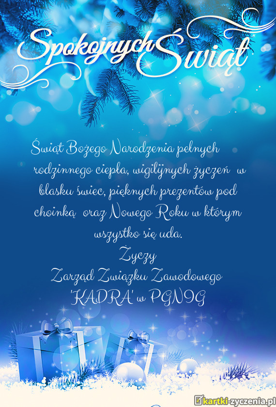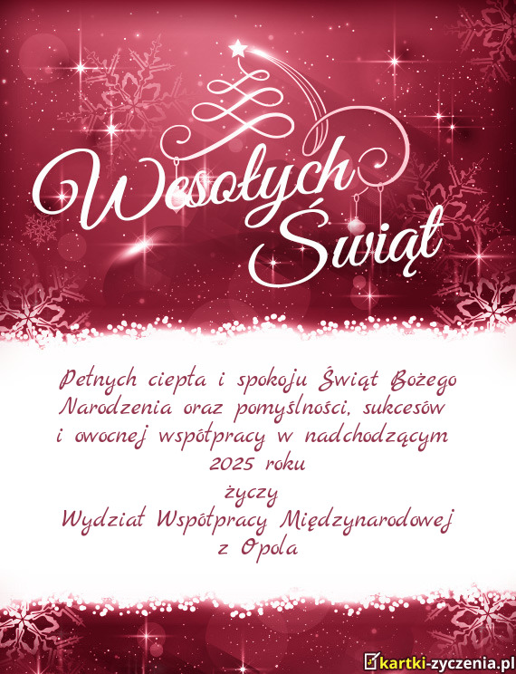 Z OKAZJI ŚWIĄT BOŻEGO NARODZENIA Z CAŁEGO SERCA ŻYCZĘ WAM, ABY TEN WYJĄTKOWY CZAS BYŁ PEŁEN MIŁOŚCI, CIEPŁA I RADOŚCI. NIECH MAGICZNA ATMOSFERA WYPEŁNI WASZ DOM, A WSPÓLNE CHWILĘ Z BLISKIMI PRZYNIOSĄ WAM WIELE SZCZĘŚCIA I SPOKOJU. ŻYCZĘ WAM, ABYŚCIE ODNALEŹLI W TYCH ŚWIĘTACH PRAWDZIWE PIĘKNO PROSTOTĘ I GŁĘBOKĄ RADOŚĆ Z BYCIA RAZEM.NIECH NOWY ROK OBDARZY WAS ZDROWIEM I POMYŚLNOŚCIĄ. ŻYCZY PAWEŁ BOGUSIA I DZIECI
