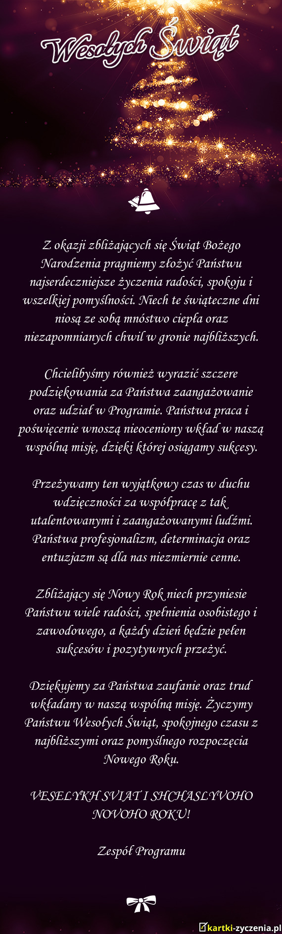 Dziękujemy za Państwa zaufanie oraz trud wkładany w naszą wspólną misję. Życzymy Państwu Wesołych Świąt, spokojnego czasu z najbliższymi oraz pomyślnego rozpoczęcia Nowego Roku.