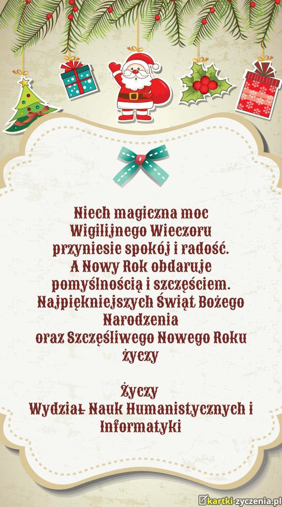 Najpiękniejszych Świąt Bożego Narodzenia oraz Szczęśliwego Nowego Roku życzy Życzy W - Gotowa Kartka bożonarodzeniowa