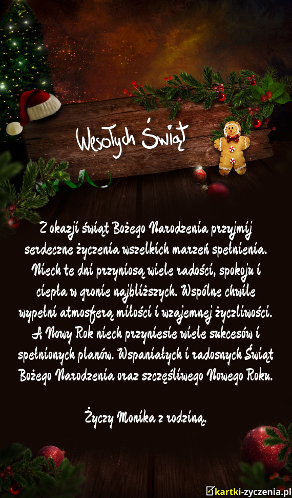 Z okazji świąt Bożego Narodzenia przyjmij serdeczne życzenia wszelkich marzeń spełnienia. Niech te dni przyniosą wiele radości, spokoju i ciepła w gronie najbliższych. Wspólne chwile wypełni atmosferą miłości i wzajemnej życzliwości. A Nowy Rok niech przyniesie wiele sukcesów i spełnionych planów. Wspaniałych i radosnych Świąt Bożego Narodzenia oraz szczęśliwego Nowego Roku.