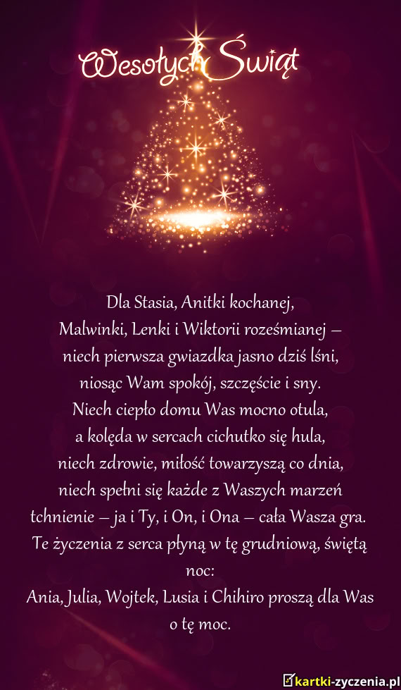 Te życzenia z serca płyną w tę grudniową, świętą noc: