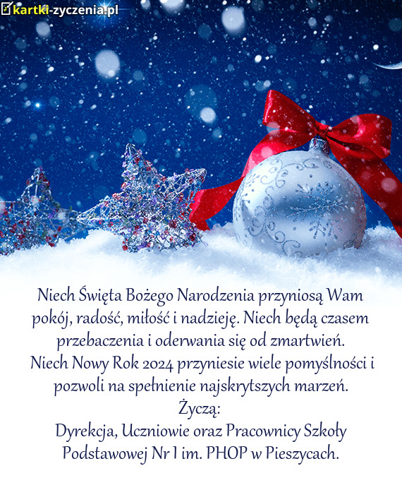 Niech Święta Bożego Narodzenia przyniosą Wam pokój, radość, miłość i nadzieję. Niech będą czasem przebaczenia i oderwania się od zmartwień.