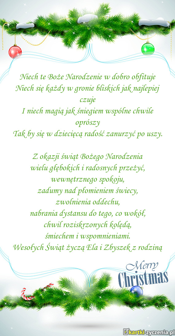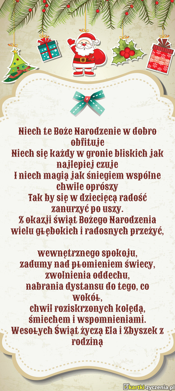 Wesołych Świąt życzą Ela i Zbyszek z rodziną